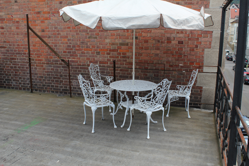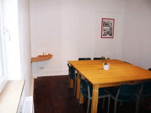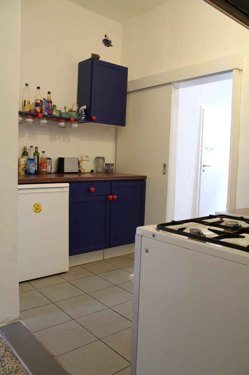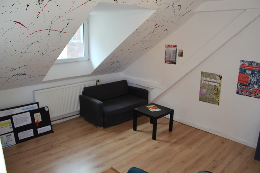 Das Haus bietet Platz für 6 Büroräume, welche verschiedenen Gruppen und Initativen für ihre politische Arbeit zur Verfügung stehen. Alle Räume sind in der ersten Etage und bilden als ganzes die Büroetage des Hauses. Zu dieser gehören auch noch eine große und eine kleine Terrasse, sowie eine kleine Teeküche und ein Gemeinschaftsraum für Austauschmöglichkeiten oder größere Gruppentreffen. Des Weiteren sind in der Büroetage auch ein Gästezimmer und das Hausverwaltungsbüro untergebracht.