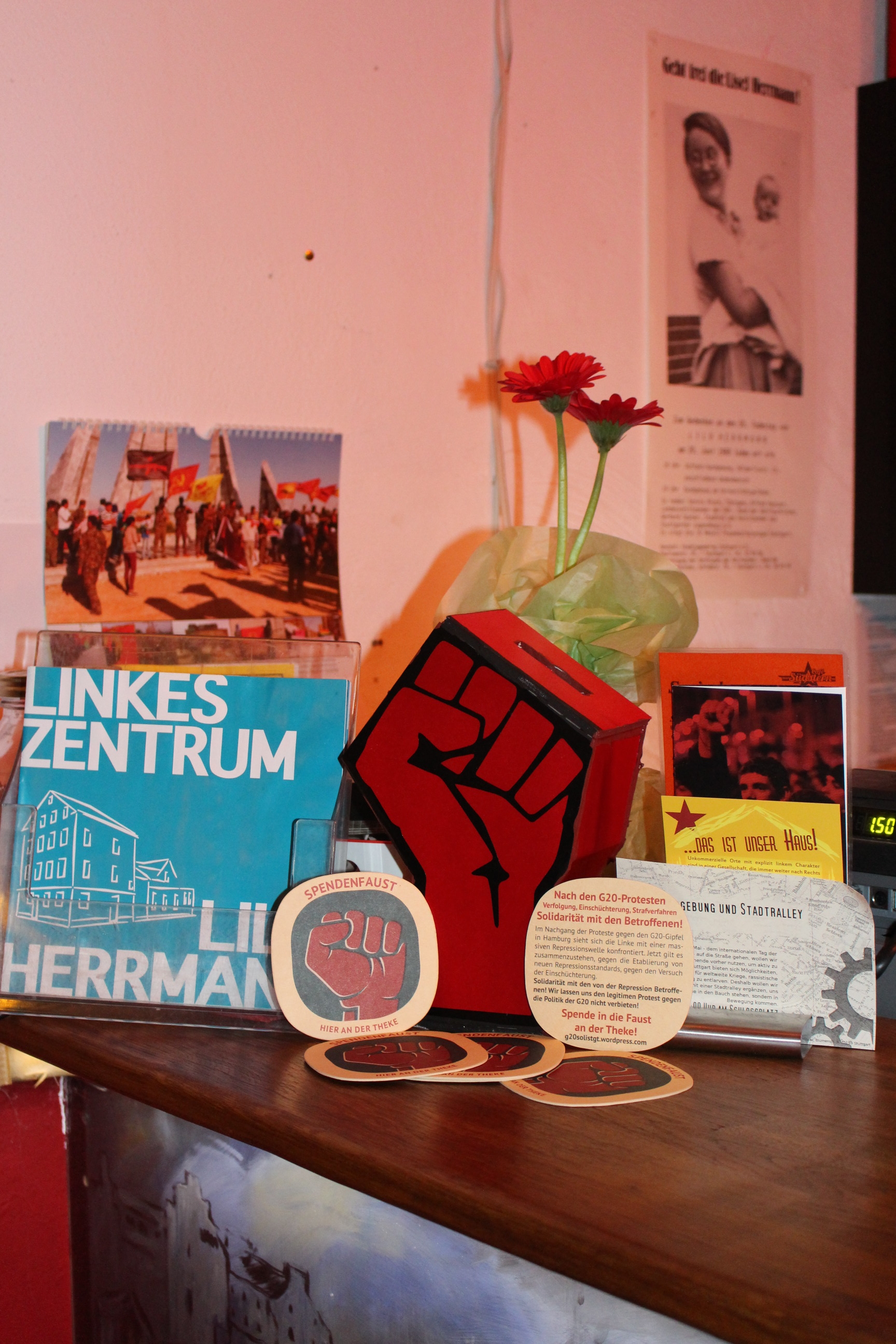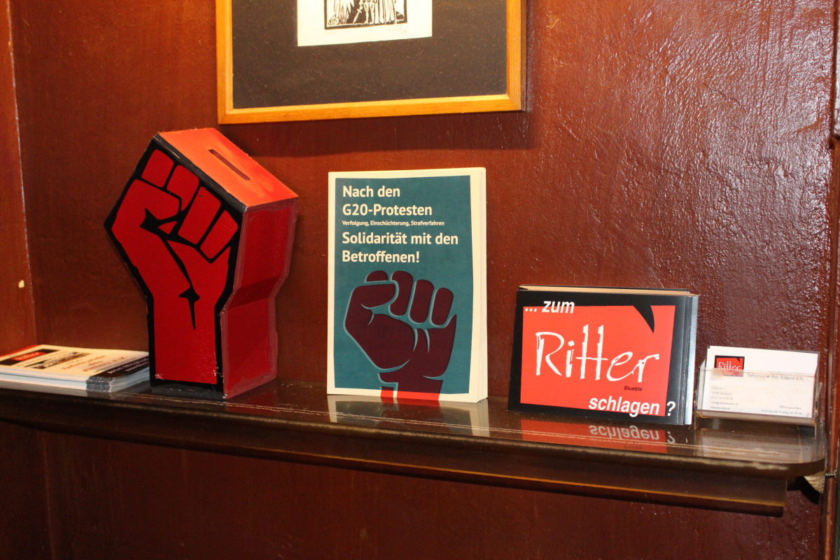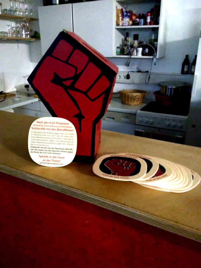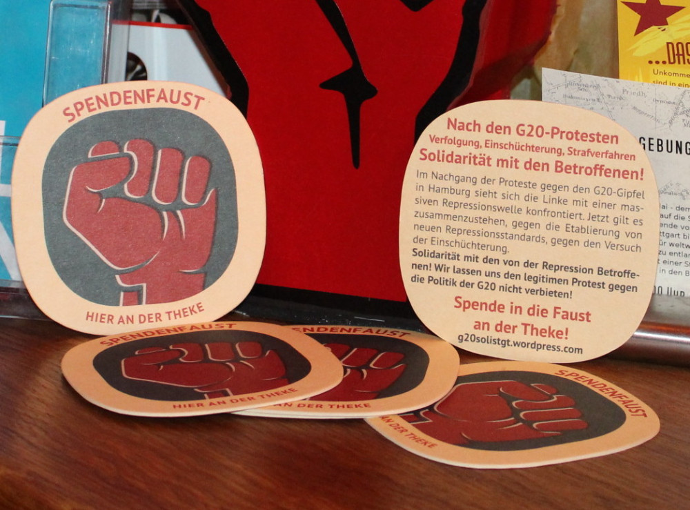 Spendenboxen warn gestern, heute gibts Spendenfäuste! Um zusätzliche Öffentlichkeit für unsere Arbeit zu schaffen und gleichzeitig unsere klamme Bündniskasse aufzubessern, haben wir in verschiedenen Locations in Stuttgart Spendenfäuste aufgestellt. Gleich mit dazu gab es die passenden Soli-Bierdeckel und Bündnisflyer, um so nochmal Aufmerksamkeit zu schaffen für die im Nachgang des G20 stattfindende Repression.
