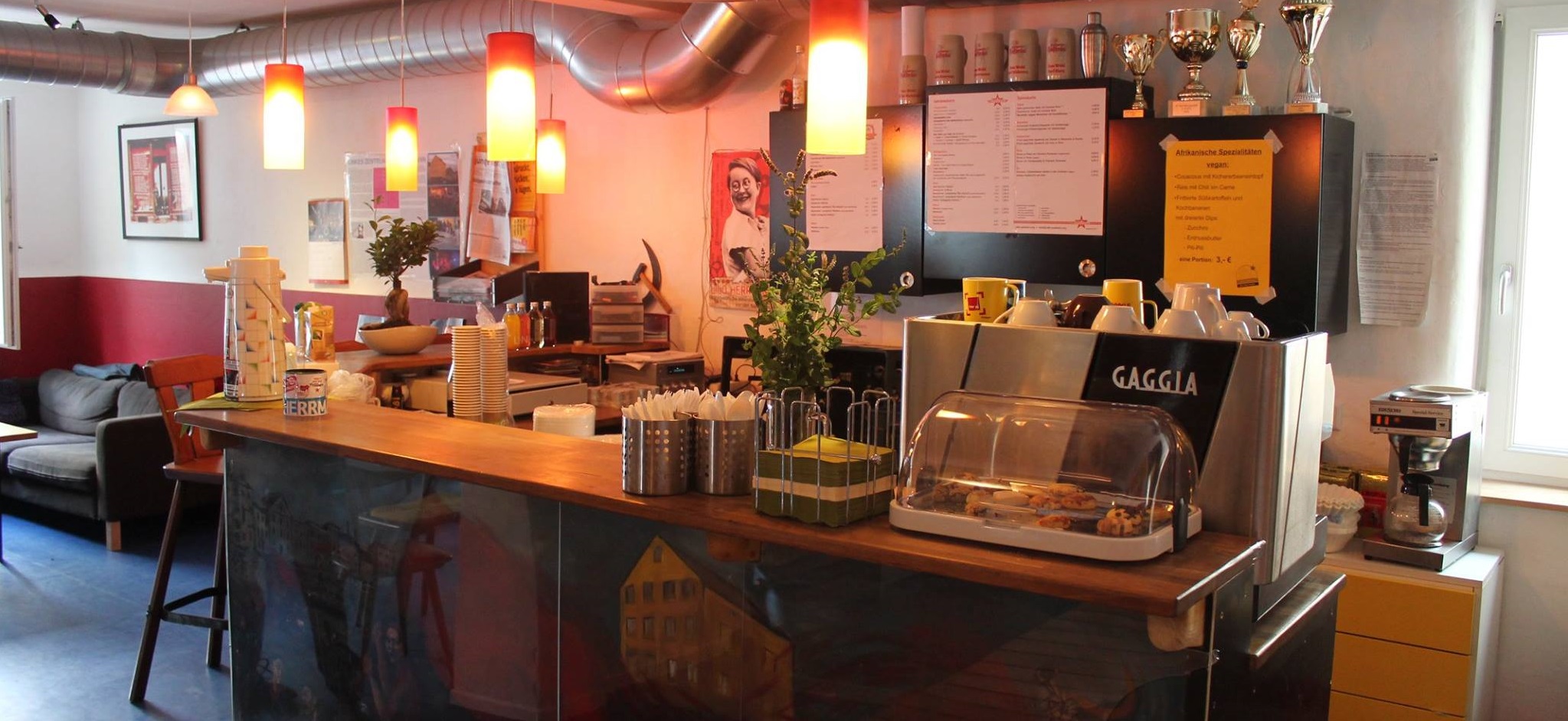 Unser Sortiment an Speisen und Getränken ist rein vegetarisch und beinhaltet auch fair gehandelte und ökologisch erzeugte Produkte. Wir arbeiten nicht gewinnorientiert, Überschüsse werden gegebenenfalls an politische, kulturelle und soziale Initiativen gespendet. Ideen zur Verbesserung und eigenes Engagement sind willkommen.