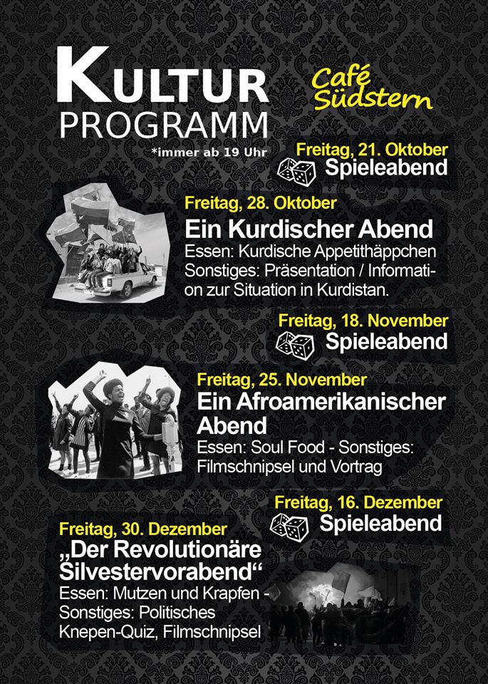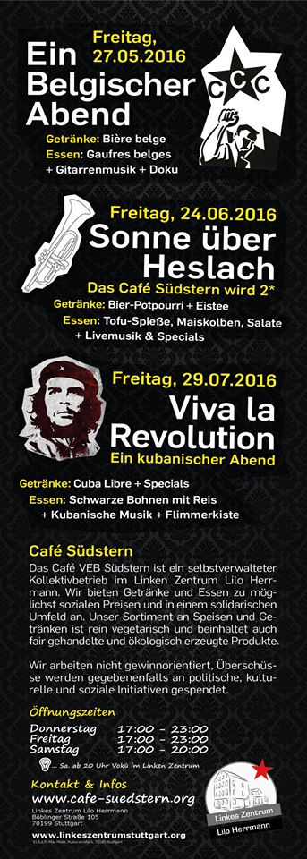 Das Café Südstern [VEB] ist ein selbstverwalteter Kollektivbetrieb im Linken Zentrum Lilo Herrmann. Wir bieten Getränke und Essen zu möglichst sozialen Preisen und in einem solidarischen Umfeld an. In unseren Räumen finden zudem Veranstaltungen statt, auch sind hier stets aktuelle Veröffentlichungen und Infomaterialien zu verschiedenen Themen und Mobilisierungen erhältlich.