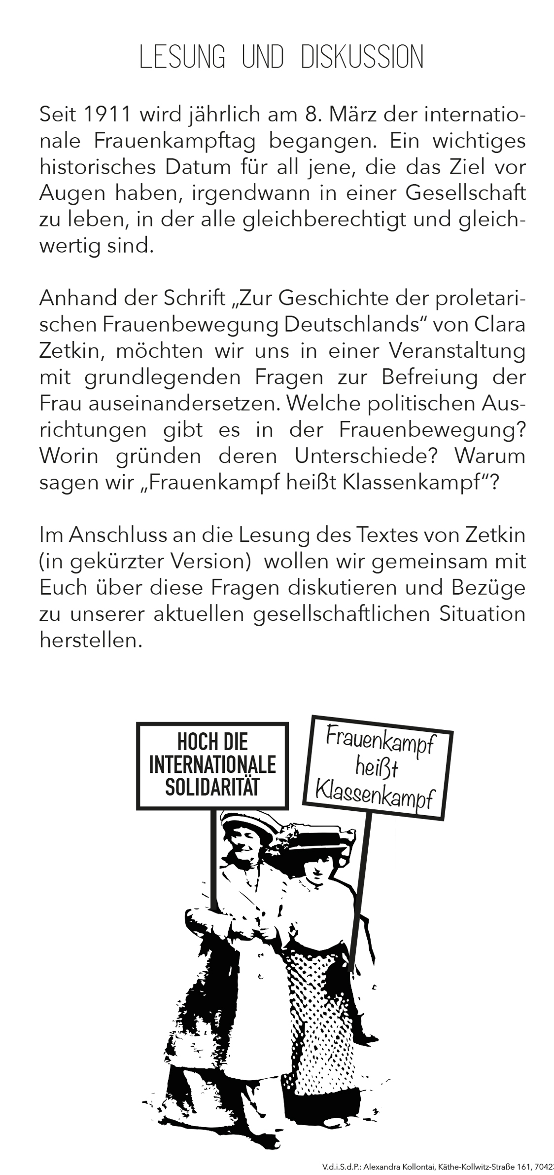 Im Anschluss an die Lesung des Textes von Zetkin (in gekürzter Version)  wollen wir gemeinsam mit Euch über diese Fragen diskutieren und Bezüge zu unserer aktuellen gesellschaftlichen Situation herstellen.
